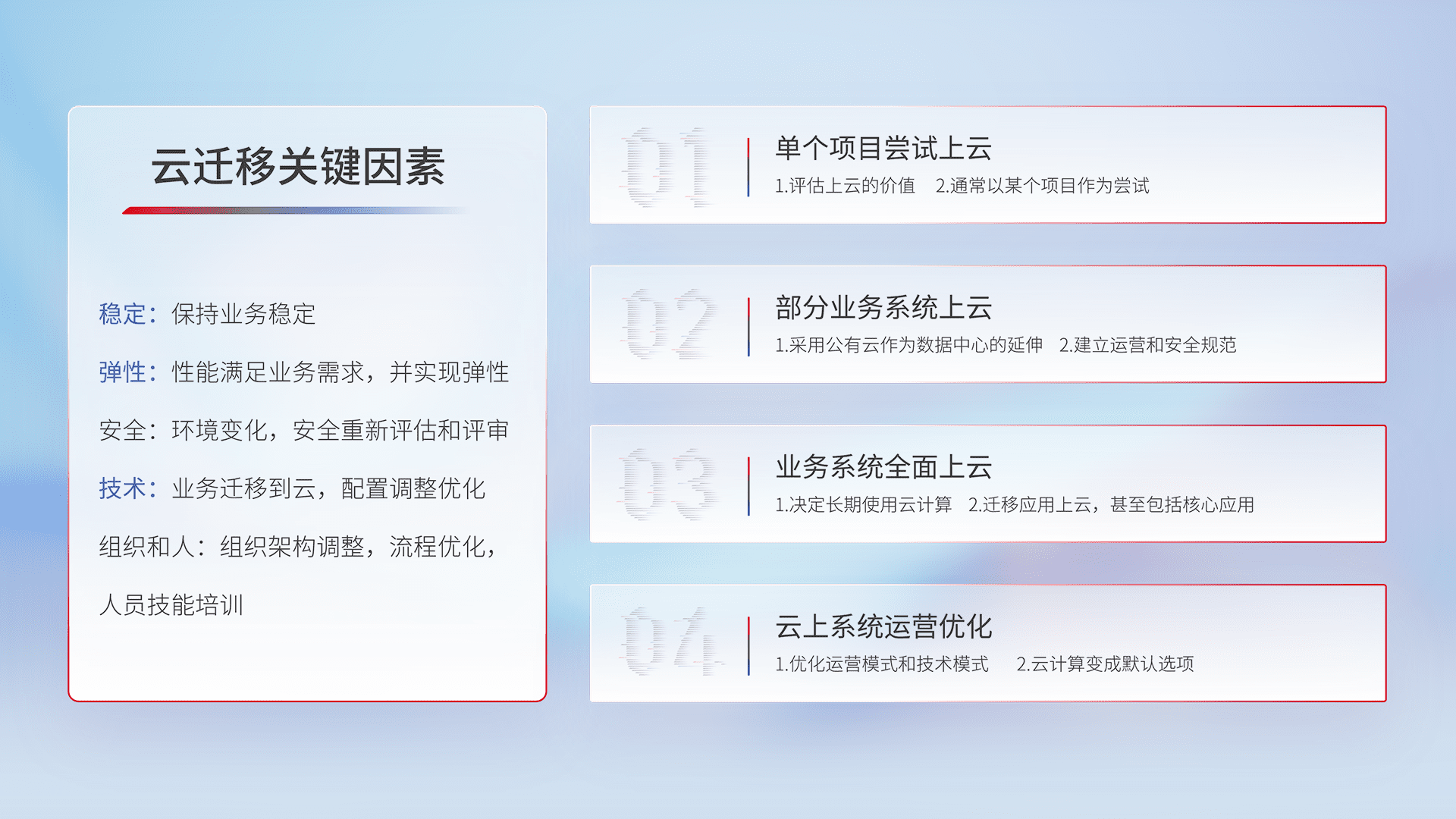 结合实际业务,,,从规划设计、、、云平台选型、、云原生改造、、、数据迁移、、、、集成交付,,迁移全过程为客户识别最佳上云路径,,做好风险识别管理,,设计网络架构、、、身份权限、、、、安全审计合规、、、操作审计、、日志审计、、、监控告警策略、、、多站点容灾设计等,,,对云上基础设施进行整体规划,,,,提升IT治理水平,,,以满足弹性、、、、高可用、、高性能的需求。。。。