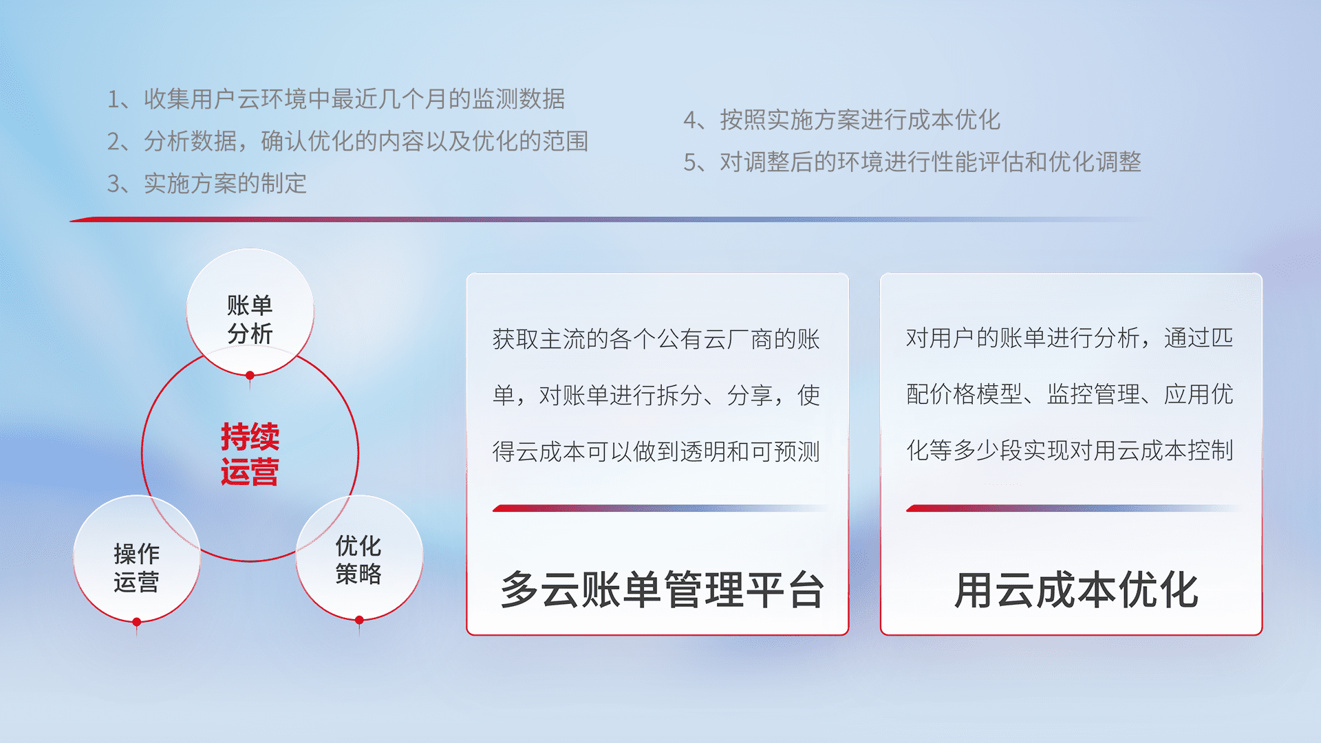 通过多云纳管,,,,以统一的资源数据模型把客户的云资源进行抽象和封装,,进而实现对多云资源的统一操作,,,,保障云资源管理的可靠性、、、稳定性与可用性。。。量身定制化运维内容,,,,配置、、、开发运维、、、、补丁管理、、备份、、、、监控、、、、认证和访问管理、、、审计和日常巡检等,,,保障在用云过程中的可靠度,,,稳定度以及高可用率。。。